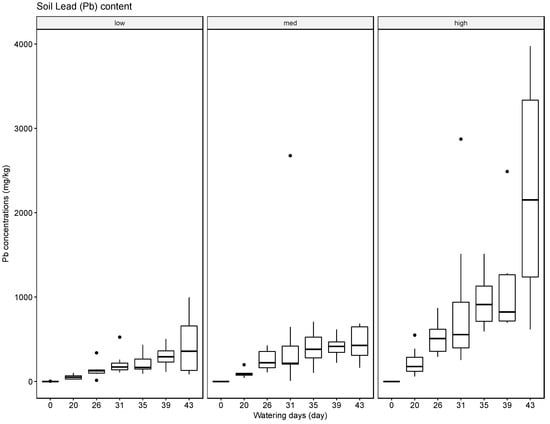The results for Pb indicate that accumulation in the soil is associated with watering days, w, and the concentration of Pb in the irrigation water (see Figure 7). At low and medium irrigation water concentrations, the soil concentration of Pb increased slowly and steadily (meanlow = 194.0 mg/kg, SDlow = 212.8 mg/kg, meanmed = 309.8 mg/kg, SDmed = 382.9 mg/kg), while for the high concentration water the slope of accumulation was larger, but also subject to greater variation (mean = 866.8 mg/kg, SD = 943.5 mg/kg). The leaves (Figure 8) showed little accumulation up to w = 31. Beyond this time point, concentrations in the leaves rose but at a markedly increased between-plant variance. No systematic differences between low, medium, and high irrigation water concentrations were detected using Tukey’s HSD test. The ANCOVA results are shown in Table 7 and, as was the case for Ba, the slopes for the soil concentrations for time vary based on treatment.