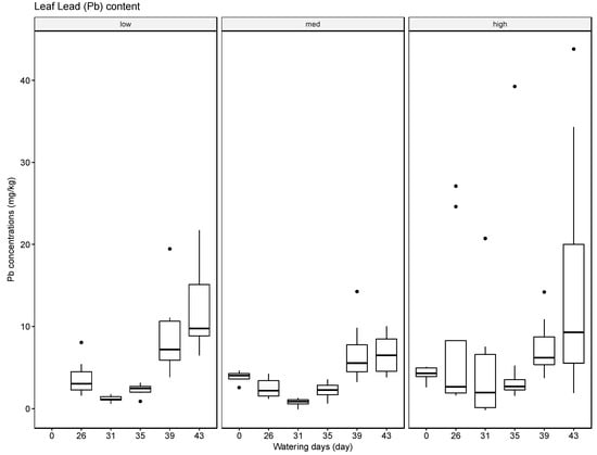 Boxplots of measured concentrations of Pb in the leaves as a function of Pb concentration in the irrigation water (low, medium, high) and watering day, w.
