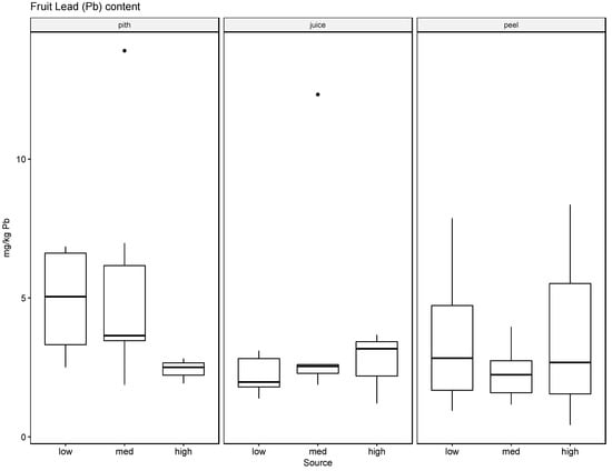 Boxplots of measured concentrations of Pb in the pith, juice, and peel portions of the harvested mandarin oranges as a function of Pb concentration in the irrigation water (low, medium, high).
