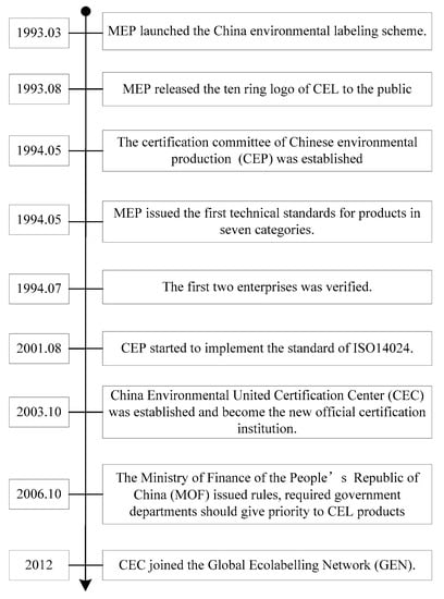 The Chinese Environmental Labeling (CEL) scheme was launched by the Ministry of Environmental Protection of the People’s Republic of China (MEP) in 1993. As shown in