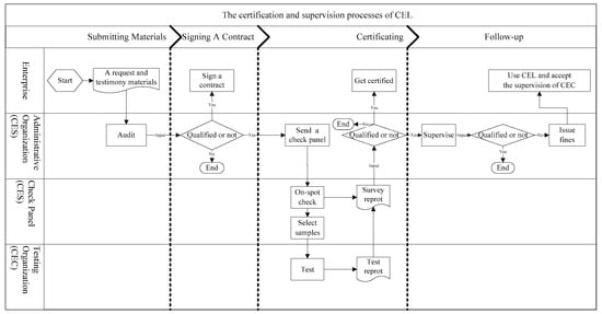 Figure 3, we can see that the certification and supervision process design of CEL seems to be rigorous. However, given that the CEC and AIC need to supervise thousands of scattered enterprises and hundreds of thousands of different products, workforce and material resources are limited for it to implement effective supervisions. Regarding this, the motivations for authorized enterprises to implement standards continuously should be analyzed, and the strategic interactions between the enterprises and government agencies should be coordinated, so that a more efficient supervision system could be formulated by the government.