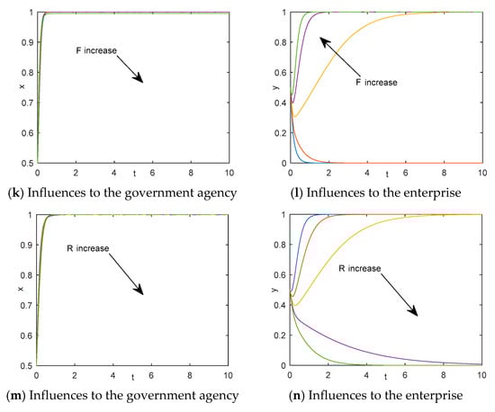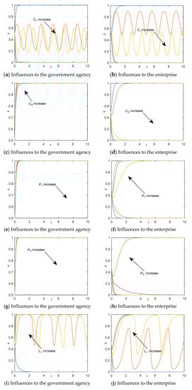 Figure 7, when the supervision costs of the government agency increase, the government agency would choose not to supervise. In terms of panel (m), if the supervision efficiency of the government agency was low, the enterprise would tend to not implement the standards.