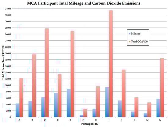 Thirteen MCA participants provided odometer readings at two timepoints: baseline and at follow-up. MCA participants’ total car mileage ranged from 710 to 9411 miles over the study period, for a group average of 4855 miles. MCA participants’ daily car mileage ranged from 3.5 to 43 miles daily over the study period, for a group average of 24 miles per day. Using the fueleconomy.gov app to calculate the corresponding carbon dioxide emissions, this translates into a total contribution of 1,580,438 g (1.6 metric tons) of additional carbon dioxide emissions from our study participants into the atmosphere during our study period. The daily contribution of carbon dioxide emissions from study participant driving ranged from 1260 to 15,396 g (1.3 to 15.4 kg), for a daily group average of 7974 g CO2 (about 8.0 kg). Figure 1 depicts the total mileage and total carbon dioxide emissions for participants with valid data across the entire study period. Figure 1 offers a visual juxtaposition of how total miles driven compares to the total CO2 equivalents emitted. It is important to note that the carbon dioxide emissions are based on the make, model, year of the car. MCA participant vehicles ranged 5–21 years old.