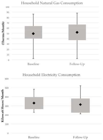 Electricity and gas consumption are depicted in Figure 2. The participants’ average household electricity consumption in the 12 months prior to baseline assessment was 331 ± 87 kilowatt hours/month (kWh/month) (mean ± s.d., n = 12). Natural gas consumption was 50 ± 25 therms/month. These correspond to emissions of approximately 3.0 and 3.5 metric tons CO2e/household/year, respectively for electricity and natural gas, based on national average greenhouse gas equivalencies [43]. This equates to approximately 8.2 kg CO2e/household/day from electricity consumption and 8.8 kg CO2e/household/day from natural gas consumption for MCA participants at baseline. The participants’ average household electricity consumption in the 12 months after baseline assessment was 314 ± 104 kWh/month (n = 11). Natural gas consumption was 52 ± 27 therms/month. These correspond to emissions of approximately 7.8 kg CO2e/household/day from electricity consumption and 9.0 kg CO2e/household/day from natural gas consumption for MCA participants at follow-up.