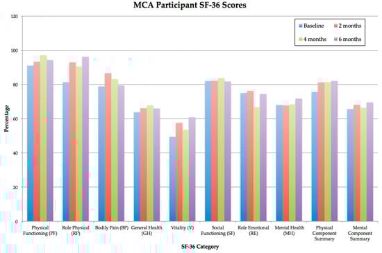 MCA participant score percentages for each SF-36 category at each timepoint across the study.