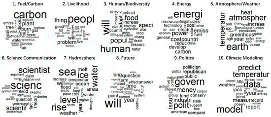 | 7 | scienc-, scientist, scientif-, polit-, denier, public, skeptic, republican, deni-, consensus, denial, claim, industri-, accept, opinion | science communication | 0.090 |