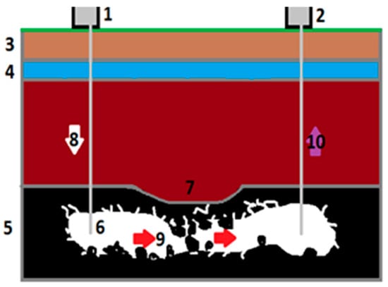 Principle of Underground Coal Gasification (Legend: 1—Injection borehole, 2—Production borehole, 3—Overburden, 4—Water table, 5—Coal seam, 6—UCG cavity, 7—Sag of roof, 8—Streaming of oxidizing gases, 9—Direction of gasifying, 10—Direction of syngas streaming).