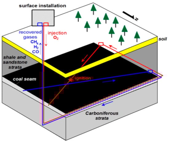 Today, economic, energy, and environmental concerns have spurred unprecedented interest in the future of clean and renewable sources of energy. Energy has been universally recognized as one of the most important inputs for economic growth and human development. There is a strong relationship between economic development and energy consumption. According to the relevant output statistics of the “global new energy development report 2016”, in 2015, fossil energy accounted for 66% of global electricity []. In terms of energy, coal is a major energy source which provides about 40% of the total electricity generation of the world []. Coal reserves significantly exceed oil and gas. Estimates of total world coal resources (including non-mineable coal) are usually stated in trillions of tons [] and recent estimates of the total remaining coal resources in the world quote a figure of 18 trillion tons []. However, the extraction of coal and production of electricity in coal-fired power stations significantly pollutes the environment and is detrimental to the global climate [,,,]. Therefore, at the European level, a lot of effort has been made in recent decades to promote the use of renewable sources in the energy market [,,,]. By 2015, almost 27% of the European Union’s reported electricity production was coming from renewables, with the expectation that under an optimal scenario, this percentage will increase to 50% by 2030 []. However, renewable energy presents its own challenges. The use of renewable resources in the energy market also has negative impacts on environment. Energy from these sources is more expensive in comparison with conventional power stations. Therefore, development of some renewable energy sources must be supported by the government in many European countries. Financing the renewable energy industry is difficult due to its characteristics of high risk and long-term investment returns and relying on existing financing channels []. Considering this brief analysis, it appears appropriate to develop clean coal technologies. Exhaustion of non-renewable energy resource reserves leads to the conclusion it is necessary to seek the possibility of obtaining energy from these resources in the most economic and effective manner, i.e., from coal beds for which open pit or underground mining are impossible due to technical or economic reasons []. Moreover, global trends aiming to reduce greenhouse gas emissions, particularly CO2, make it necessary to develop clean coal technologies including underground coal gasification []. Underground coal gasification (UCG) is a technology permanently developed in world where coal is burnt in a controlled manner and gasified under in situ conditions to produce syngas which can be converted into various types of fuel, such as gas for electricity generation or even oil. Development of UCG continued for the next 78 years in the Soviet Union and included successful commercial production at numerous sites. During this time, the formerly Soviet Union conducted roughly 200 field tests and several commercial projects producing over 15 million tons of coal. Much of this was at the electric power plant in Angren, Uzbekistan that is still in operation after 53 years []. The World Energy Council estimates that UCG could enable the economic recovery of 600 billion tons of coal reserves, allowing companies to access coal that has previously been considered ‘non-minable’. Although the concept of UCG is not new as it dates back more than 100 years, renewed interest in UCG technology has recently occurred in most coal producing regions of the world [,,,,,,,,,,,]. Recently, several researchers have investigated UCG, focusing on electrical power generation [,,] or on hydrogen production [,,].