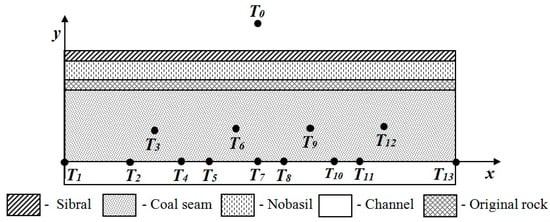 For the verification of the described mathematical model a simulation model was created that simulated the heat transfer process of underground coal gasification in laboratory conditions (see geo-reactor in Section 2.1.1). The localization of thermocouples, surrounding rocks and coal in cross section is depicted in Figure 5. Places of the temperature measurement are schematically depicted using thermocouples in the Generator (temperatures in the channel—T1, T2, T4, T5, T7, T8, T10, T11, T13, temperatures in the coal seam—T3, T6, T9, T12 and atmosphere temperatures T0) during gasification experiment. Sibral and nobasil are insulating materials to prevent the thermal loss to the environs. The gasification channel was created using the following method: coal blocks drilled in the longitudinal direction were bonded into the monolith and laid in the laboratory gasifier. The thickness of the experimental coal blocks was 0.35 m. The ignition of coal was at absolute zero point.