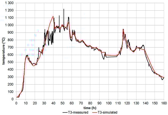 The inputs into the simulation model were directly measured atmosphere temperature (T0) and channel temperatures. The time dependence for velocity vector (, ) was defined by measuring of the movement of the gasification front. Output from simulation model was the indirectly measured (predicted) temperature in the coal seam with the simulation model. After the experiment the indirectly measured temperature was compared with the directly measured temperature from experiments performed and the precision of the mathematical model was determined. The comparison of the directly measured temperature with the predicted temperature using the simulation model with thermocouple T3 is shown in Figure 6. There is maximum relative deviation between predicted and measured temperature of 22% at the 52nd h. This maximum relative deviation could be caused by coal combusted collapse from roof subsidence at the thermocouple during short time because the relative deviation was 2.8% on average in this experiment. The deviation between 30 and 40 h is probably caused by a jump change of measured temperature by thermocouple T3.