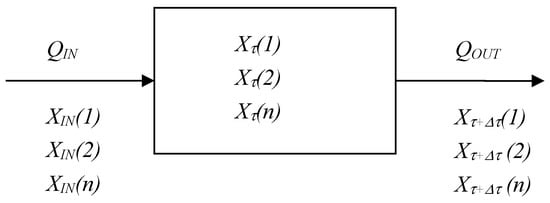 where is the concentration of the first component of the internal gas element, is the concentration of the first component of inlet gas, is the concentration of the n-th component of the internal gas element, is the concentration of the n component of inlet gas, is volume flow of the input gas, is volume flow of the output gas, is volume of element.