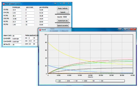 Figure 8 shows a preview of the simulation model for mixing of gases. In the top left corner the form for entering the input data is shown and in the bottom right part the graphic output is shown. In the chart you can see a change in the concentration of individual gas components for the element over time.