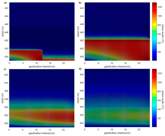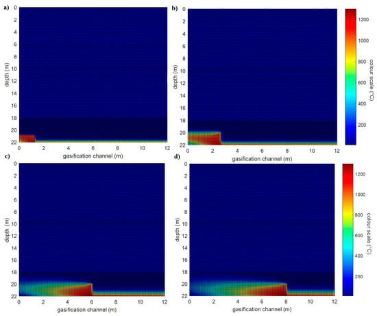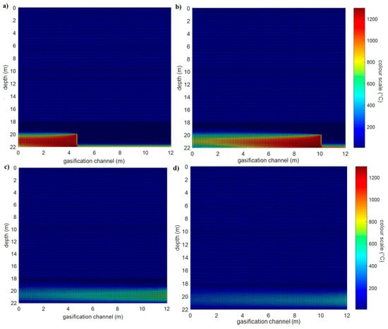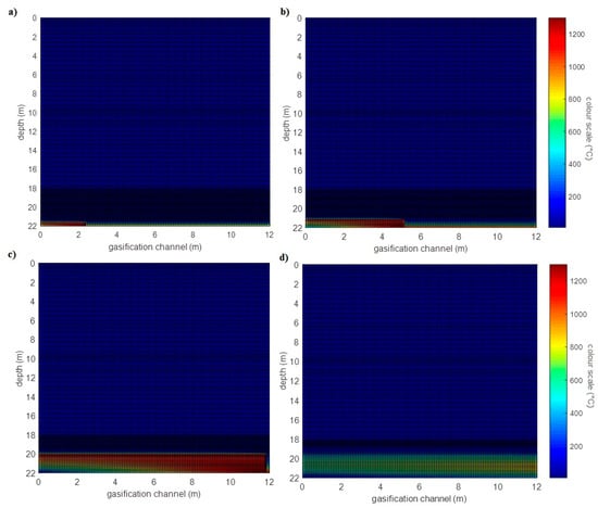 The total thickness of overburden was 20 m in the simulation process. The overburden consisted mainly of the following layers: Shale, Sandstone, Clay and Sand. The thermo-physical properties of individual layers, dimensions of overburden and the coal seam from the real coal seam marked as Barbara were used. Two-dimensional temperature fields were simulated before the start, during and after UCG. The total time of 2640 h was considered for the simulation. Simulations were performed with three different velocities of the movement of the gasification front in the underground coal gasifier. At first, the gasification process considered took place with 1 m/day velocity of the movement of the gasification front in the direction of the gasification channel (axis ) in accordance with experiments. The gasification front movement for coal seam located under the earth’s surface at a depth of around 20 m is shown in Figure 9. This figure is the result of a simulation process considering 2 m thickness and 12 m length of coal seam.