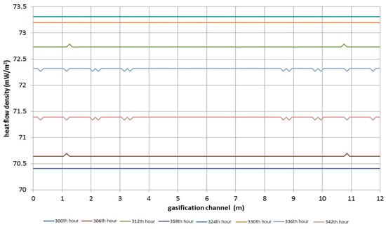 The heat flow density from the earth’s surface to the ambient environment for the selected times is shown in Figure 10. The selected times are marked by colored lines under the graphs in Figure 10 and others. There was a value of 70.4 mW/m2 based on the initial temperature condition at the start process and it was same after 300 h. The change of the heat flow density started in the 306th and it was finished in 342nd h.