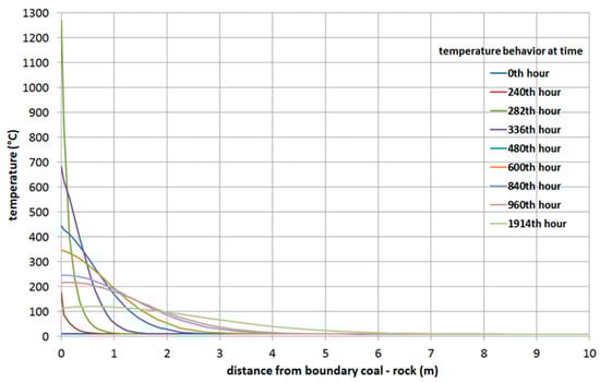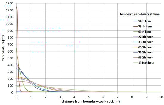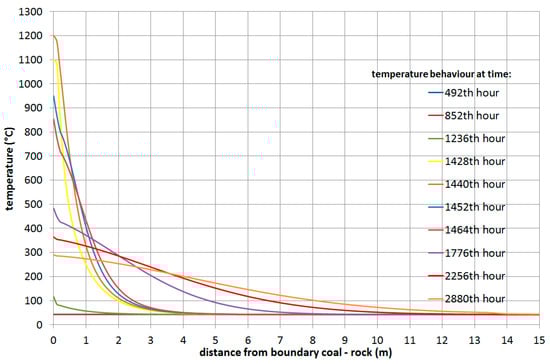 The behavior of the temperature from the boundary of the coal and overburden to the earth’s surface in the gasification process is shown in Figure 11. This temperature was assumed in the center of overburden. This figure shows the temperature change at this place for the selected times. It is visible that temperatures above 600 °C are located at a distance circa 0–0.2 m from the boundary of the coal and overburden. The changes of the temperatures of overburden layers are visible into the distance circa 6.2 m from this boundary.