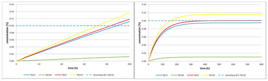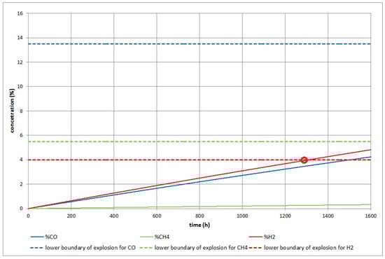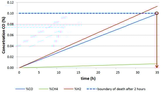 Use of the simulation model for the UCG process can be divided into two parts. In the first part we focus on the possibility of explosion caused by a leak of syngas. The second part of the simulation studies CO poisoning. Using a mathematical model for syngas streaming through porous media, syngas flows from the UCG cavity into different cuts of the overburden are calculated including earth surface to the surroundings []. Values of the volume flow of syngas calculated by mathematical model of syngas streaming were used as inputs into the model for mixing of gases to determine the critical time for explosion and for CO poisoning.