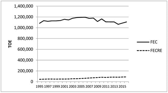 Descriptive statistics: FEC, FECRE (in MTOE), and ratio for the 1995–2016 period.