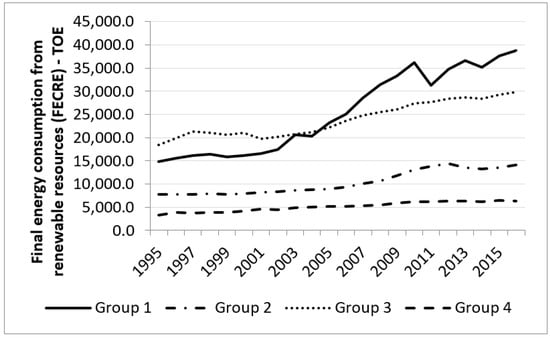 According to the EU Directive [2], by 2020, the final energy consumption should decrease by 20% from the 1995 level. It can be noted that Group 1 experienced a small decrease of 1.48%, while for the other three groups there are significant increases (of 10.8%, 2.97%, and 9.89%, respectively).