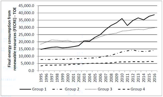 Final energy consumption from renewable resources in the 4 groups of countries (in TOE).