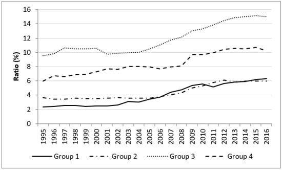 From Figure 10, it is clear that the consumption of energy from renewable sources increased in all 4 groups, with a significant increase being recorded in the first group of countries (162.36% in 2016 compared to 1995), followed by the Group 4 countries with an increase of 88.81%, those in Group 2 by 81.08%, and those in Group 3 by 61.94%.