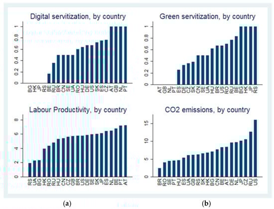 Variables of interest, by country: (a) digital servitization and labor productivity, by country; and (b) green servitization and CO2 emissions, by country. The horizontal axis refers to the ISO two-digit country code and the vertical axis to the mean of the variable of interest.