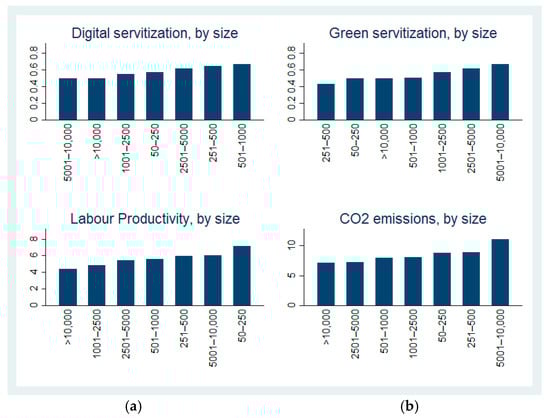 Variables of interest by size: (a) digital servitization and labor productivity, by size; and (b) green servitization and CO2 emissions, by size. The horizontal axis represents classification of companies based on number of employees and the vertical axis the mean of the variable for interest.