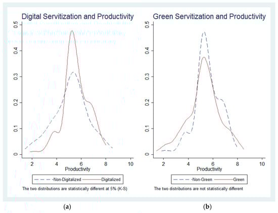 As a warm-up exercise, we computed labor productivity distributions for firms undertaking digital (or green) servitization and compared them to the productivity distribution of their counterparts, i.e., non-digitalized (or non-green) firms. This enables us to test graphically whether the most productive firms are servitized. The Kolmogorov–Smirnov test [] provides statistical validity for the comparison of distributions. This test can thus establish a graphical bivariate correlation between the variables of interest.