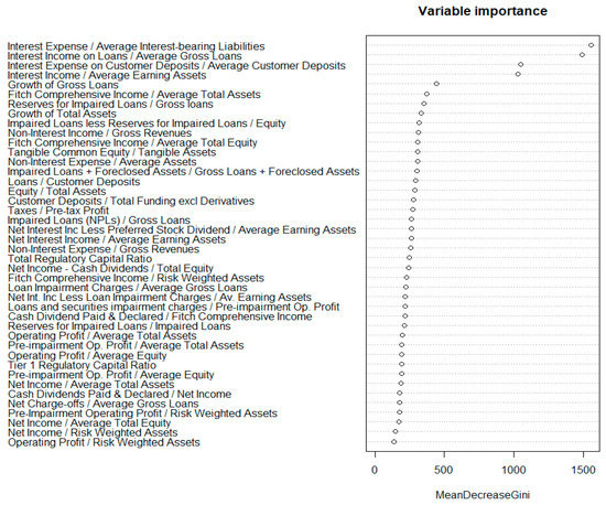 A useful property of random forests is that it provides variable importance measures that help identify the most important variables for distinguishing between active and inactive banks. Hence, RF should provide some clues to the underlying causes of bank failures. For classification trees, we obtained the variable importance measures from each variable’s contribution to the reduction in the Gini index. The Gini index is a common measure of the degree of inequality in income distribution. The smaller the value of the index, the more equal the society.