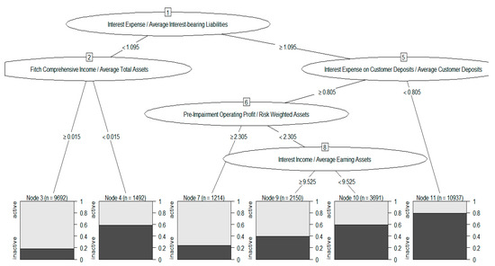 We show the experimental result of a single decision tree in Figure 3 for comparison. Though a single tree selects similar criteria to distinguish between active and inactive banks, it does not perform as well as random forests. This is due to the fact that the random forests model produces a more flexible model as it produces multiple trees to analyze different patterns in the data, whereas a single tree only produces one set of rules for a classification decision.