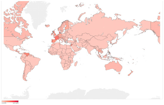Finally, we visualized the degree of a country’s financial vulnerability by creating a Financial Hazard Map. Corresponding to each definition of vulnerability in Table 1, we present two types of maps. Figure 5 shows the share of EPALj in the assets of domestic banking sectors. The areas that are darker red indicate a higher degree of vulnerability in terms of the impact of the expected potential asset loss on the domestic banking sector. Figure 6 shows the share of EPALj in nominal GDP. Darker red areas indicate a higher degree of vulnerability in terms of the impact of the expected potential asset loss on domestic economic activities.
