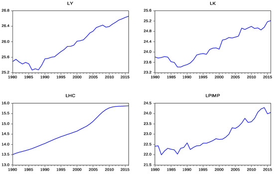This research uses annual time series for the UAE from 1980 to 2016, obtained from national and international sources. Specifically, GDP (Y) and working age population (HC) are derived from the World Development Indicators-World Bank, while merchandise exports (X), primary imports (PIMP) and manufactured imports (MIMP) are obtained from the World Trade Organization. The data series for Gross Fixed Capital Formation (K) is taken from IMF, National Bureau of Statistics and World Bank. All the variables are expressed in logarithmic form and real terms, using the GDP deflator taken from the World Bank. The descriptive statistics and plots of the log-transformed data are shown in Table 1 and Figure 1 respectively.
