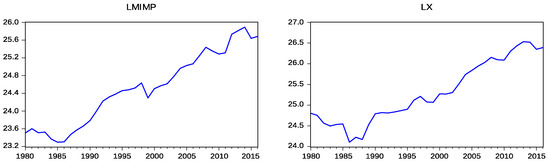where LYt, LKt, LHCt, LPIMPt, LMIMPt and LXt represent the variables of the proposed model (Equation (4)), βij, γij, δij, ζij, θij and μij are the regression coefficients, while p is the optimal lag length, selected by minimising the value of Schwartz Information Criterion (SIC).
