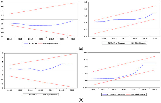 After estimating the VAR model, diagnostic tests are conducted in order to determine whether the models are well specified and stable. These tests include the Jarque-Bera Normality test, the Breusch-Godfrey LM test for the existence of autocorrelation, the White Heteroskedasticity test, the Multivariate ARCH test and the AR roots stability test. In addition, the cumulative sum of recursive residuals (CUSUM) and the CUSUM of squares (CUSUMQ) tests are performed in order to detect parameter instability in the equations. Specifically, the CUSUM test detects systematic changes, while the CUSUMQ test detects haphazard changes in the parameters [37]. The CUSUM test proposed by Brown et al. [37] is based on the statistic: