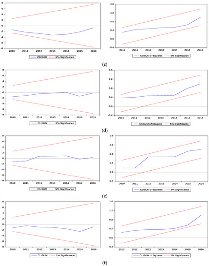 Since the aim of this research focuses on the relationship between trade, technology, human capital and economic growth, emphasis is placed on the structural stability of the parameters of the estimated error correction models for LYt, LKt, HCt, PIMPt, MIMPt and Xt (Equations (19)–(24)). The CUSUM plots (Figure 2) for the estimated ECMs show that there is no movement outside the 5% critical lines. Therefore, the estimated ECMs, including the impulse dummy variables for the years 1986 and 2009, are stable. Thus, there is no reason to test for the presence of a third structural break.