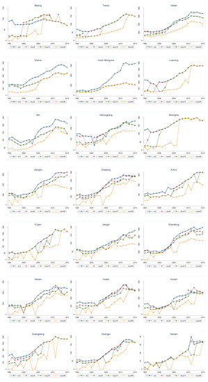 Table 3 shows that the measurement results of these three technical efficiencies under different environmental regulations exhibit few differences. The provinces consistently located at the production frontier of environmental efficiency are Tianjin, Liaoning, Shanghai, Fujian, Guangdong, and Yunnan. The provinces with relatively low environmental efficiency are Shanxi, Inner Mongolia, Guizhou, Shaanxi, Gansu, Qinghai, Ningxia, and Xinjiang. The environmental efficiency of the remaining provinces fall between these two groups. The provinces with relatively low environmental efficiency are mainly the central and western provinces, whose low technical environmental efficiency are caused by their smooth economic growth and low rate of energy utilization efficiency. This opinion is also supported by Hu and Wang [63]. Apart from Yunnan, the provinces situated at the production frontier of environment efficiency are generally economically prosperous provinces located in Eastern China whose high-technical environmental efficiency could be caused by their rapid economic growth, relatively reasonable industrial structure, and high rate of energy utilization efficiency.