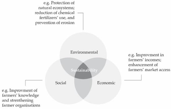 Fairtrade (FT) is one of these production systems, which has emerged over the past few decades to promote sustainable agriculture in developing countries [6]. According to De Pelsmacker and Janssens [7], FT is an alternative trade approach, which aims to offer better trading conditions to marginalized producers and workers in developing countries. Specifically, FT certification provides small farmers with higher prices, access to pre-financing, protection against price fluctuations, and price premiums which enable them to adopt sustainable agricultural production techniques [8]. To access these benefits, farmers are required to comply with certain sets of environmental and socioeconomic “sustainability” measures and regulations [9]. The socioeconomic measures aim to enhance small farmers’ income stability, strengthen farmer organizations, and improve farmers’ access to markets on fairer terms. The environmental measures aim to foster sustainable agricultural production by imposing stricter regulations on pesticide use, water conservation, soil erosion, biodiversity, and energy use, and reducing the carbon footprint of agriculture [10]. That is, FT is an integrated multi-dimensional approach that is closely linked to the sustainability concept, and can be viewed as the intersection of its three main dimensions, as illustrated by Figure 1. The means through which FT attempts to achieve the sustainability objectives includes payment of higher and therefore “fair” prices to developing country producers, which allow those producers not only to increase their income, but also to develop their skills and knowledge and benefit their communities and environment [11].