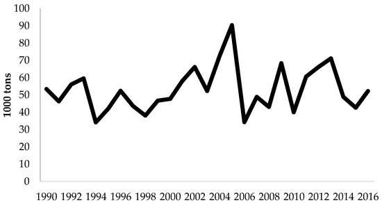Coffee is produced in three areas in Tanzania, namely the Northern Highlands (the Kilimanjaro and Arusha regions), the Southern Highlands (the Mbeya, Ruvuma, and Ludewa regions), and the Western Lake Zone (the Kagera region) [34]. Figure 2 shows the quantities of Tanzanian coffee produced during the period 1990–2016. Overall, coffee production in the period was characterized by sharp fluctuations, particularly during the past decade. The amount produced ranged between 34,000 tons in 1994 and 90,000 tons in 2005, averaging 53,000 tons per year during the study period. Part of these fluctuations is attributable to the biennial bearing nature of coffee trees, i.e., yielding a heavy crop in one year and a light crop in the following year [35]. As coffee production is significantly price–elastic, market prices are another main driver causing fluctuations in production [31]. For instance, following the international price spike in 2009 resulting from a global food crisis, Tanzanian coffee production increased from 43,000 tons in 2008 to around 70,000 tons in 2009.