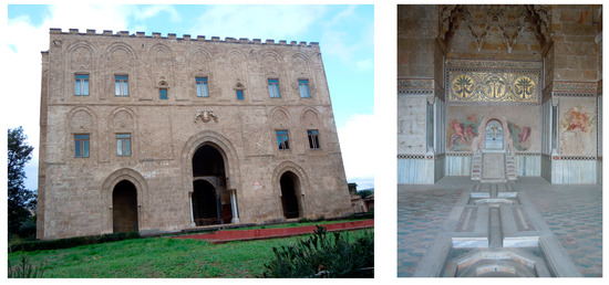 Main facade of Zisa in Palermo and the fountain inside.