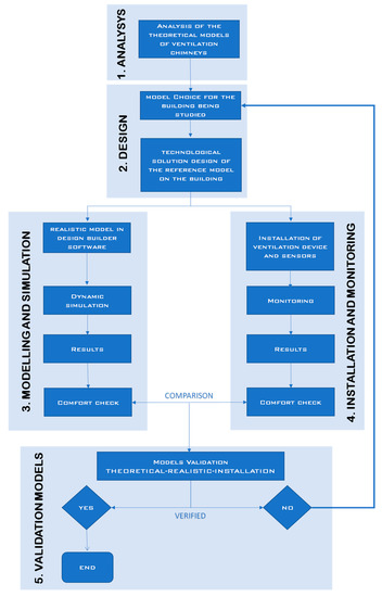 The methodology for this research consisted of five steps—the analysis of ventilation chimneys, design of a ventilation device, simulation with software, installation and monitoring, validation of models and concludes with testing. The methodology of the study is shown in Figure 3.
