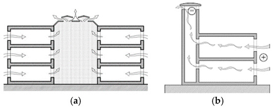 A cross section of an internal court ventilation chimney (a) and a tower ventilation chimney (b).