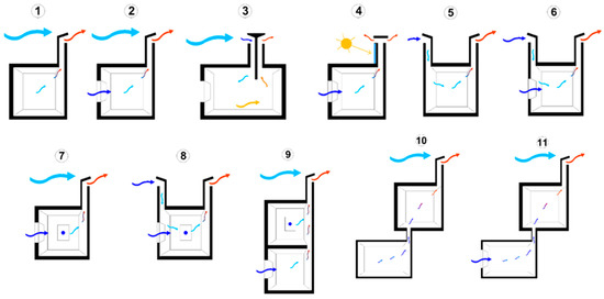 “Wind towers” (common in Arabic architecture) are another example of passive ventilation and well-known structures that apply the principle of natural convection to cooling. A wind tower is constructed from the foundations of a building and undergoes internal subdivisions into a series of chimneys and vertical ducts before emerging at the top of the building. Convective motions (adjustable with a series of doors and openings) are triggered between ducts, which influence the circulating air temperatures as desired. The motion of the air accelerates in the presence of wind and the cooling effect is often increased by “evaporation” through fountains carefully positioned in the passage of the currents; an important contribution to cooling is also the humidity arising from the subsoil and the foundations [13,14].