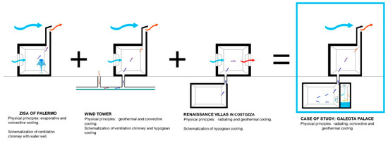 Another innovative project of cooling and natural ventilation can be found in Zisa (Figure 1), the summer residence of kings in the city of Palermo (Italy). The natural ventilation and cooling of the castle were achieved as a result of five elements: the large fishpond in the front; the fountain on the ground floor; two ventilation chimneys; large damp towels hanging in the various rooms on the upper floors; and two side towers similar to “ventilation chimneys” connected to all three floors of the structure (Figure 2). The sea breezes were first cooled by the pool and the fountain, the wind then entered the building and began to warm up. Hot air rose through the ventilation chimneys due to the cooler air below (“chimney effect”). Thus, natural circulation of air was created in all of the rooms and facilitated by a series of holes in the doors. Hot air was also cooled by large damp cloths hanging from the beams, the fittings of which are still visible today. Aesthetic comfort and awareness of the environment makes Zisa an outstanding example of bioclimatic architecture [11,12].
