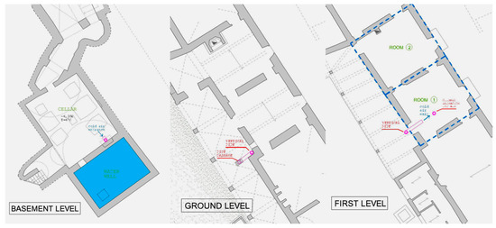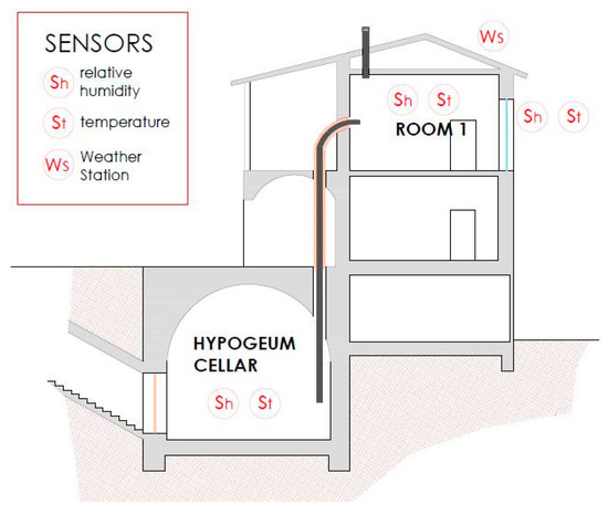 The section in Figure 13 shows the position of the sensors. There are two sensors for temperature and relative humidity in the hypogeum cellar, room 1, room 2 and outside. There is also a weather station positioned on the roof for the recording of atmospheric pressure, rainfall, anemometer and wind direction data.