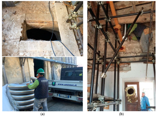 Preliminary steps for duct installation: (a) removal of the grid from the cellar window for the passage of the duct and storage in the site yard of the duct; (b) duct installation phase.