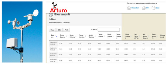 Electronic monitoring enabled us to obtain the data in real time for this study. Sensors for temperature, humidity, rainfall, wind direction and an anemometer were installed (indoor air quality was not monitored in this study but would prove of interest in future studies) (Figure 11). This sensory network was made up of elements able to measure, elaborate and send data to a central station and incorporated a network protocol for communication with the various sensors, an application necessary for the treatment and memorization of the data, an external interface for the consultation and analysis of data, a database as well as a web server with a specific web application (Figure 12).