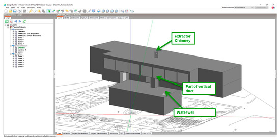 Figure 6 shows the ventilation chimney analyzed in the case study, which consists of a wind tower that connects two internal areas of the building, situated on the different levels, with an opening on the lower floor [25,26] as well as ducts designed to achieve passive ventilation based on the systems used in the Renaissance villas of Costozza, Torri del Vento and the Zisa di Palermo.