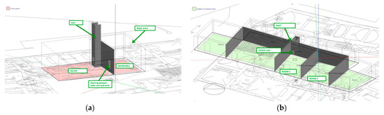 Only one wing of the building was modeled (Figure 14). Figure 15 shows the outline for the modeling of the hypogean level and rooms 1 and 2 of the first floor. The duct was simplified to represent a true and proper ventilation chimney. Residential use was assumed for the two rooms in the simulations, so metabolic activity was set to 1.2 (relaxed) and typical indoor clothing to 0.5.