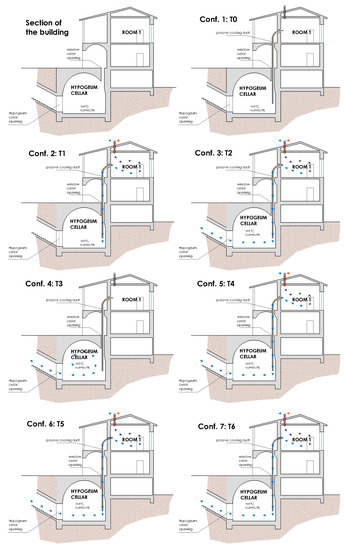 As has been fully described elsewhere [22], a duct connects the basement to room 1, transporting cold air from the underground room up to the first floor (Figure 8 and Figure 9). As the original windows were removed as a result of the 2009 earthquake, the openings were sealed with a PVC sheet to guarantee the room the same solar gains. This certainly favored incident solar radiation and an increase of indoor temperature, producing a hothouse effect similar to glazing.