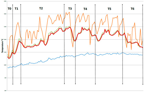 After the installation of the sensors, data was recorded and monitored from May through to the first week of September. During this period, the building was monitored under seven different configurations (Table 4), to verify and optimize the system according to the different weather conditions and surroundings. These configurations related to different periods Time 0, Time 1, Time 2, etc..., as shown in Table 4 and Figure 17.