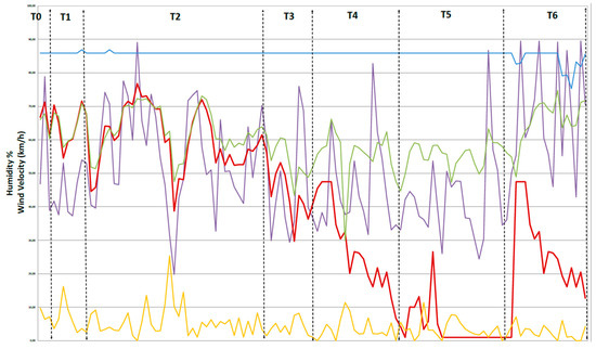 The graph registers the temperature on the y-axis and the days monitored on the x-axis. The whole period has been divided into seven periods: from T1 to T6. The external temperature is in orange, the temperature in the cellar—blue, Room 1—red and Room 2—green. In the first monitoring period, the temperature in room 2 is lower than in room 1, while, in the last period, the curve overlaps and is often reversed. This is because, during the first monitoring period, the system is still not yet fully operational and by the last period there is optimal operation. The following graph illustrates the relative humidity of the two rooms, the cellar and the outside and wind velocity (Figure 19).